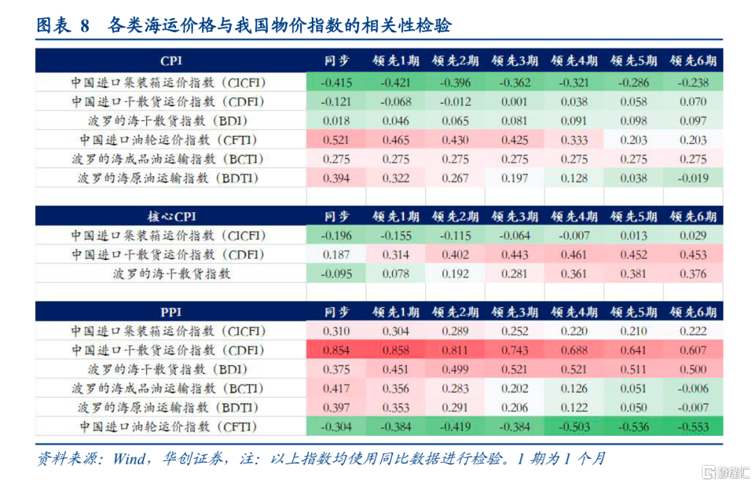 各類海運價格與我國物價指數的相關性檢驗。選擇國內外具有代表性的三類海運運價指數,與我國的CPI、核心CPI、PPI進行相關性檢驗。結果顯示,領先1期的中國進口乾散貨運價指數(CDFI)同比與我國PPI同比的相關性極強,相關係數爲0.854;當期的中國進口油輪運價指數(CFTI)同比、波羅的海原油運輸指數同比與我國CPI同比有一定相關性,相關係數分別爲0.521、0.394;領先4期的中國進口乾散貨運價指數(CDFI)同比與核心CPI同比也有一定相關性,相關係數爲0.461。其餘運價指數與我國物價指數的相關性很弱甚至不相關。