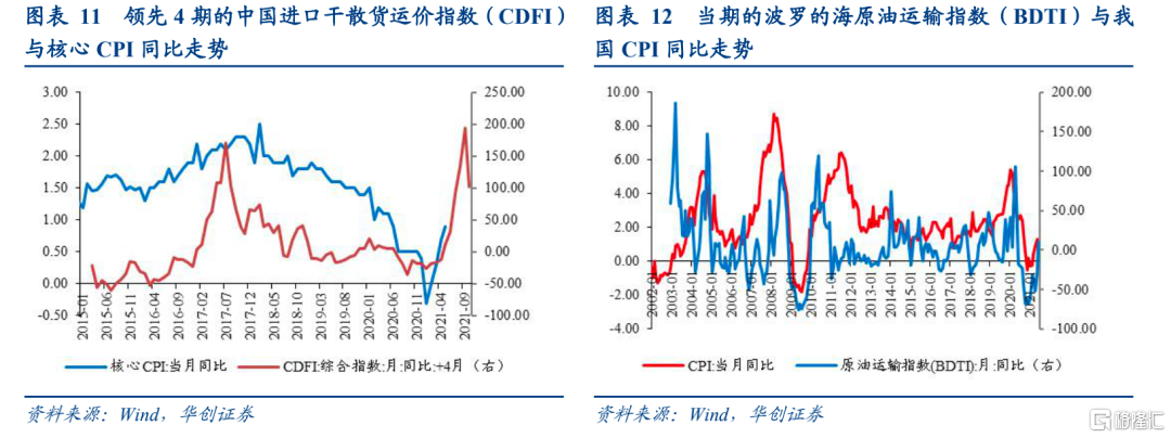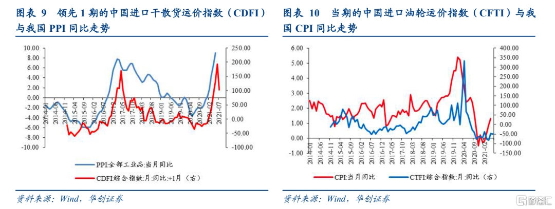 大宗價格會從需求端影響海運運價,而大宗品也是重要的輸入性通脹來源。在實際操作中,很難將大宗品價格的影響從海運運價與通脹的相關性走勢中剝離出來,並且從中國進口乾散貨運價指數(CDFI)與PPI的例子中可以看到,海運運價與通脹走勢的相關性較強,大概率是因二者都受大宗品價格漲跌的影響。這也意味着,海運運價與通脹的關係更多的是相關性而非因果性,可能無法從二者的相關性走勢中推導出海運運價會對通脹產生明顯影響的結論。