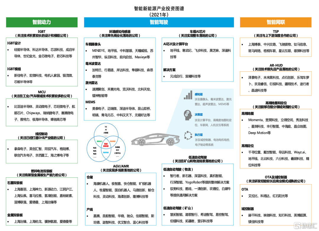 展望2021年,我們對中國汽車產業轉型發展的前景依舊樂觀,汽車產業正在不斷出圈,逐漸成為”智能新能源”跨界變革的平台,是我們繼續看好的賽道。我們認為,行業變革的催化劑將來自國產替代的加速以及自主創新的湧現,中國構建“汽車強國”的戰略目標正推動着產業加速變革。我們延續產業電動化、智能化、網聯化並行發展的脈絡,從智能動力、智能駕駛、智能網聯3個維度,遴選12個細分賽道,深入挖掘產業的一級市場投資機會,建議關注:車規級IGBT賽道中技術積累較足的設計和模組公司、車規級MCU賽道中在工業/汽車領域技術積累較多的公司、線控制動賽道中已經打通EHB產業鏈的創新公司、燃料電池雙極板賽道中具備新型金屬板生產能力的創新公司、環境感知傳感器賽道中率先商業化的初創公司、車載AI芯片及計算平台賽道中實現整車落地的頭部公司、低速自動駕駛賽道中能夠在礦山和物流場景中落地的科技公司、AGV/AMR賽道中能夠實現多場景落地的公司、國產TSP賽道中與上下游深度合作的未上市公司、AR-HUD技術領先且產品落地的頭部公司、高精地圖和定位賽道中能夠在細分領域突圍的公司、OTA和域控制器賽道中研發經驗較豐富且商業模式成熟的公司