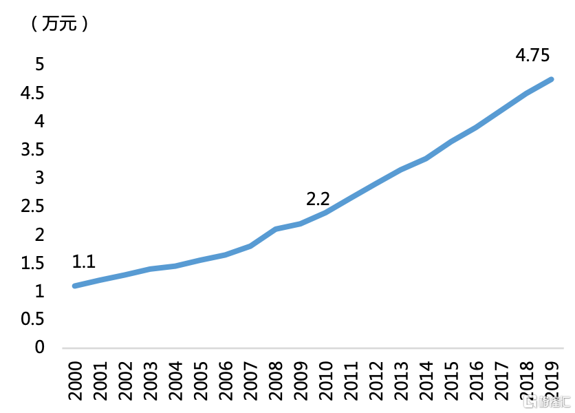 過去十年間,由於中國經濟快速增長,中國城鎮居民人均可支配收入實現了較大增長。根據國家統計局數據,中國居民人均可支配收入2019年達到4.75萬元,比2000年的1.1萬元增長了332%。汽車作為大件可選消費品的典型代表,其銷量增長的主要驅動力來自於居民可支配收入的增長。