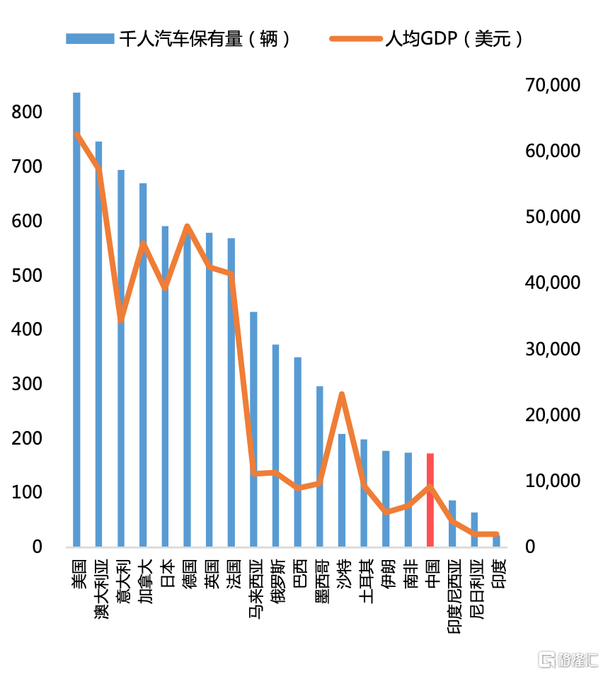 根據世界銀行發佈的數據,2019年中國千人擁車量為173輛,位列榜單第17名;美國千人擁車量達837輛,是中國的近5倍。與發達國家甚至許多發展中國家相比,中國的車輛普及率仍然較低。橫向比較來看,千人保有量仍有較大的提升空間。現階段的汽車產業處於增速換擋期,隨着經濟增速的放緩以及人均汽車保有量的提升,消費者新增需求放緩,表現為保有量、銷量與經濟增速保持中速增長,年銷量將保持平穩,度過該段增速換擋期後,汽車保有量仍會繼續增長。從人均GDP和汽車保留量的相關性也可以推斷,經濟水平的不斷提高和消費升級將是推動汽車保有量增長的長期動力。