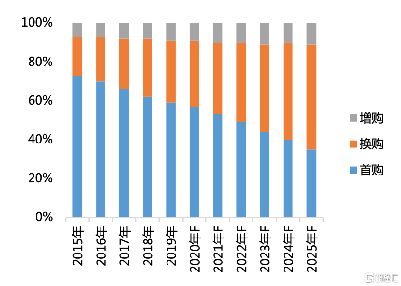在乘用車消費市場不斷髮展、汽車普及度不斷提高的情況下,中國乘用車消費中換購需求的佔比也在不斷上升。根據國家信息中心數據,2018年中國乘用車銷量中接近30%的需求為換購需求,並且隨着汽車保有量的繼續增長,今後換購需求的佔比仍將不斷提升。另一方面,隨着新能源汽車用車安全性、便利性的提升,新能源汽車的首購數量也將持續增加,2019年的新能源汽車滲透率為4.7%,目前各方正在全力推動2025年實現20%的目標
