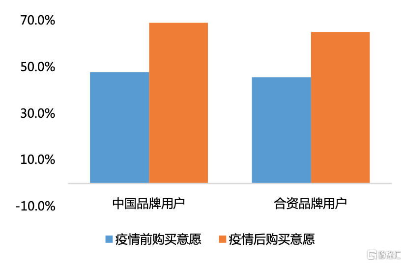 2020年,新冠肺炎疫情在全球蔓延且仍在持續,其持續時間和影響程度仍無法確定。這一認知使得消費者對購車觀念發生了一定程度的轉變。與共享出行和乘坐公共交通相比,使用私人交通工具變得更受歡迎。巨量算數調研顯示,中國品牌的強購買意願用户佔比從疫情前(2020年1月)的47.9%上升至疫情後(2020年6月)的69.1%,合資品牌的強購買意願用户佔比也從45.7%提升至65.2%。車輛能夠提供相對獨立封閉的出行環境,更多用户從弱購買意願轉變為強購買意願,這在一定程度上刺激了汽車消費。