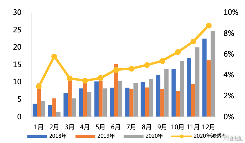 圖2 新能源汽車滲透率持續提升(萬輛)
