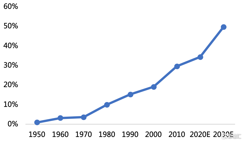 圖5 1950-2030年汽車電子成本佔比變化及預測