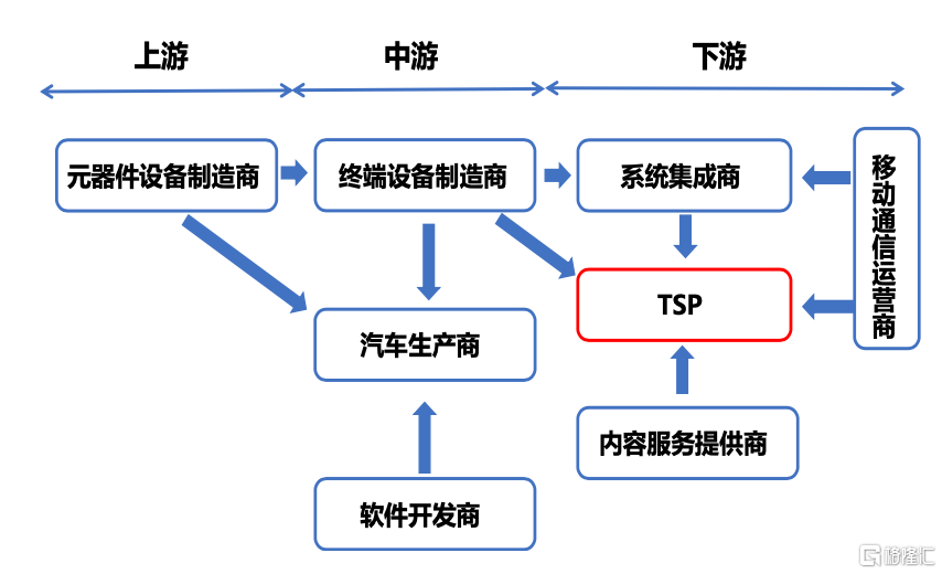TSP處於車聯網產業鏈下游的核心位置,能夠整合各方資源,既可以直接面向客户服務收取費用,也可以與政府機關、廣吿商、保險公司、物流公司等開展一系列的商業合作,拓展B2B業務從而分配利潤。TSP上接互聯網應用/服務提供商、電信運營商、內容/服務提供商,以獲取互聯網應用服務資源、各類內容服務資源和通信資源,並對內容、應用進行整合,基於TSP建設經驗來幫助整車廠和合作夥伴開展TSP平台的總體架構設計和建設,從而與汽車製造企業共同為車主和客户提供更好的車聯網服務。