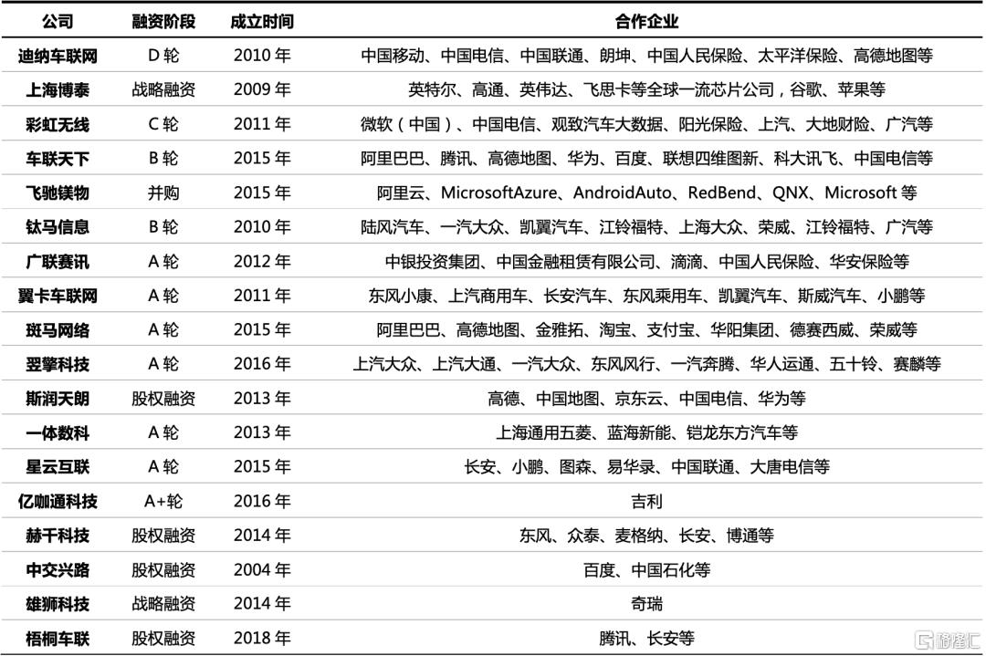 我們認為,具備投資價值的公司應具備如下的特質:能夠積極與頭部車企、互聯網巨頭、雲計算合作;不僅能夠提供汽車數據和製作,而且能夠通過互聯網運營模式提供增值服務。建議關注上海博泰、中興交路、飛馳鎂物、鈦馬信息、斑馬網絡、梧桐車聯、星雲互聯等公司的一級市場投資機會