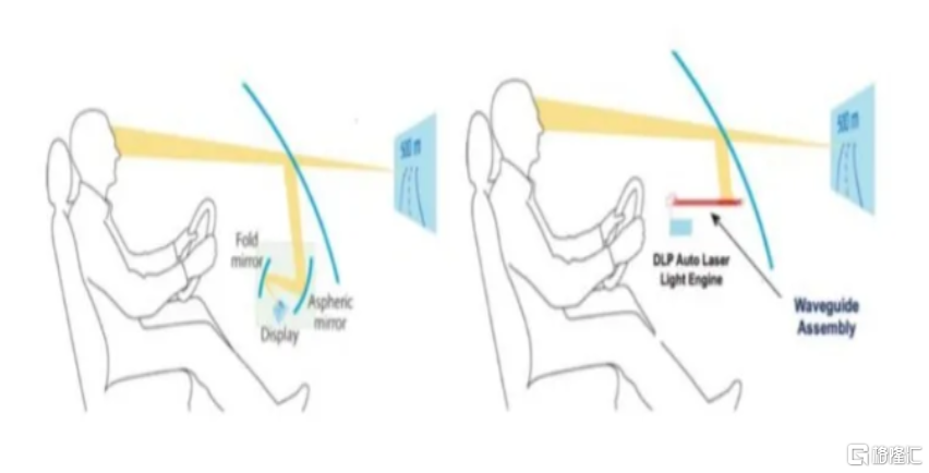 HUD基本硬件架構主要包括信息採集單元、控制單元和投影單元。其中,HUD信息採集單元負責採集信息;控制單元用於接收採集單元採集的信息,並將信息處理後輸出;投影和顯示單元負責生成屏幕圖像,然後利用投影設備將圖像通過反射/折射鏡投影至駕駛員視線前方的屏幕(即擋風玻璃)上。投影設備包括光源和光機,其中光機組成依據不同投影方式來劃分,如DLP、TFT。