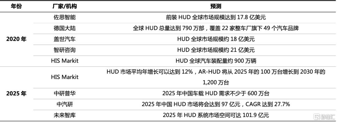從市場規模角度分析,根據Visteon數據,2018年全球HUD出貨量約為500萬套。考慮到2018年全球乘用車銷量約7,400萬,則當前HUD在全球乘用車市場滲透率約為6.7%,而HUD單套均價為180美元左右,2018年市場規模約為9億美元。隨着5G逐步落地、投影顯示技術逐漸完善,產品成本逐漸降低,主機廠紛紛推出搭載HUD產品的新車型,滲透率加速提升,市場機構普遍預測2025年市場空間可達百億。