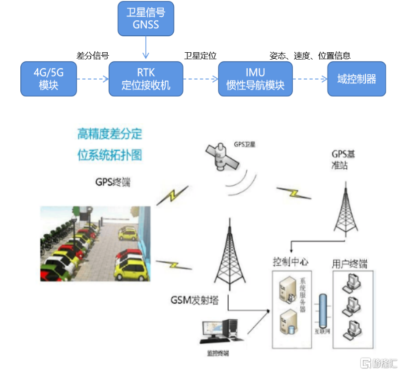 根據場景以及定位性能需求的不同,自動駕駛行業有多種高精度定位方法。其中,使用最廣泛的定位方法是融合GNSS/RTK&IMU。GNSS/RTK定位精度高,IMU更新頻率高,將其結合起來實現優勢互補,可提高定位精度,實現低延遲、高精度、高頻率的實時定位。通常而言,該系統由有車內和車外兩部分組成,包含4G/5G模塊、RTK接收機和IMU等