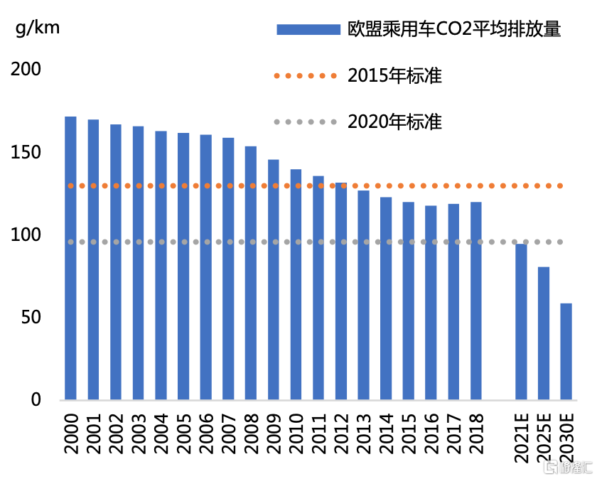 2019年,歐盟發佈的《2019/631文件》規定,2025年、2030年新登記乘用車的二氧化碳排放在2021年(95g/km)的基礎上分別減少15%、37.5%。這意味着,歐盟範圍內全部新銷售汽車的每公里二氧化碳排放不能超過95g,即新銷售汽車行駛100公里的油耗不能超過3.24L。對汽車生產商而言,這是個巨大挑戰,該文件倒逼車企推廣新能源汽車