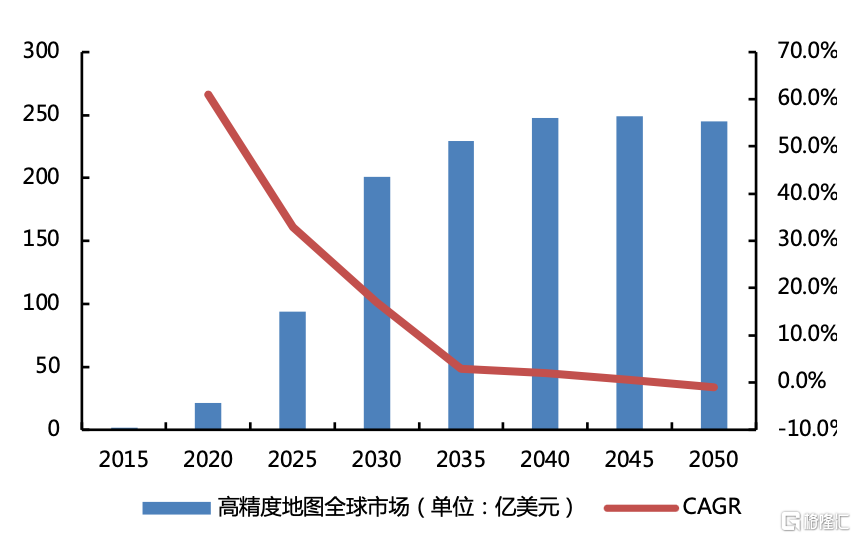 根據高盛對全球高精度地圖市場的統計與預測,全球高精度地圖產業2030年有望突破200億美元。據蓋世汽車研究院預測,到2025年,中國自動駕駛車輛將達到367萬台,高精度地圖將達到近80億元。融合高精度定位服務,2020年中國V2X用户將超4,000萬,若按30%需求實現高精度定位能力,市場規模就將達到1,200億元。按照政策目標,2025年高精地圖滲透率預計達到25%,市場成熟後滲透率預計超過50%。