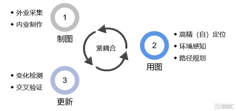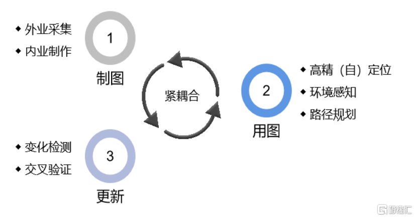 高精度地圖的測繪過程的完整閉環包括製圖、用圖更新三個緊耦合的過程,以保證數據的高頻流動和更新。製圖包括外業採集和內業製作,用圖包括高精定位、環境感知和路徑規劃,更新包括變化檢測和交叉驗證,其中較為關鍵的環節是高精度地圖的採集和更新。