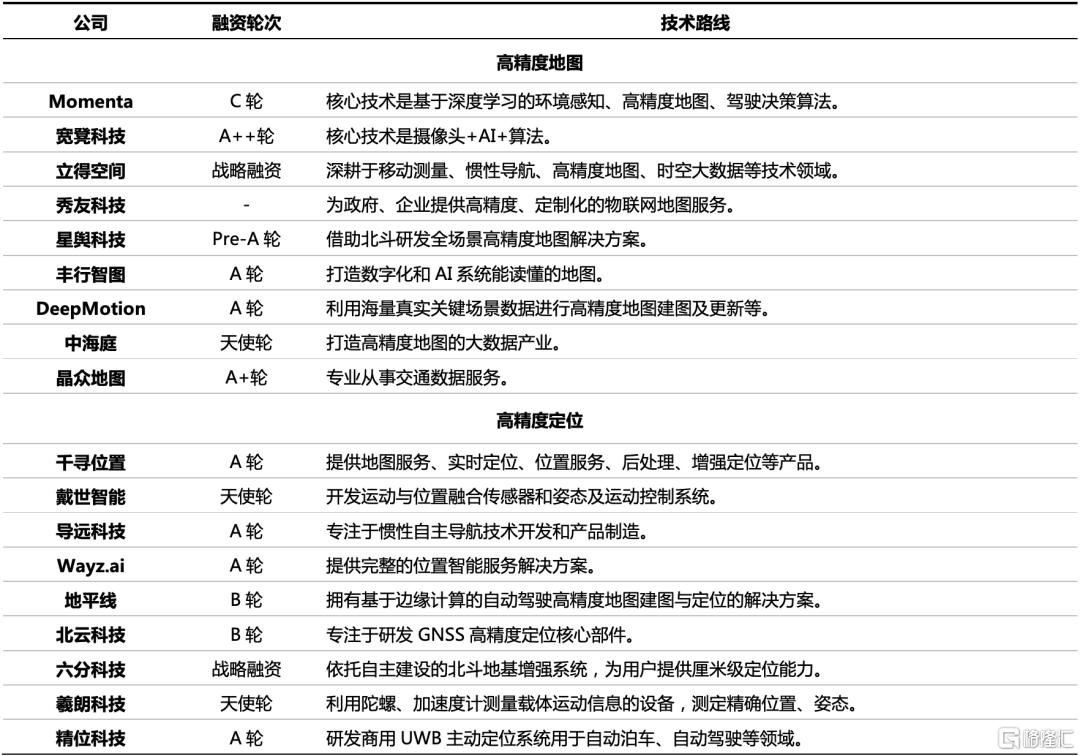 我們認為,自動駕駛的高精度地圖及定位服務並不是一家圖商或者幾家公司就能完成的大命題,需要行業內的各大玩家抱團一起來推動向前發展,高精度地圖最終可能形成通用的“一張圖”,不同測繪公司之間的數據壁壘終將打通,但商業模式需要探索。建議關注寬凳科技、晶眾地圖、千尋位置、北雲科技、精位科技等公司的一級市場投資機會