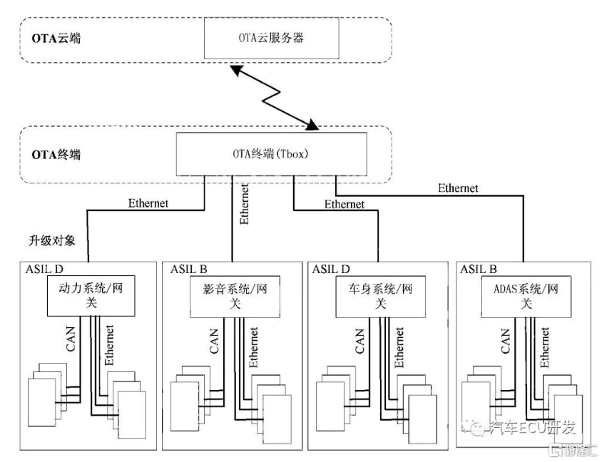OTA整體架構包含OTA雲端、OTA終端、OTA設計對象三部分。OTA雲端為OEM專屬的雲端服務器平台;OTA終端採用Tbox;網絡架構按功能域劃分,可以分為動力系統域、車身系統域、影音系統域、ADAS主動安全域,分為四個不同的功能安全等級