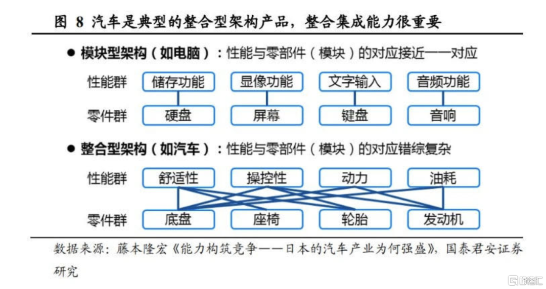 放在汽車領域,燃油車有大量的差異化空間,掌握在終端廠商自己手裏。一個是裝配與車身設計,有很多Knowhow的積累:比如從同一個供應商採購的零件,有的品牌就能通過機械工藝的調教,讓零件運轉更加穩定;另一個是自研核心零部件:比如豐田的發動機省油,日產的發動機穩定,寶馬的發動機性能強。
