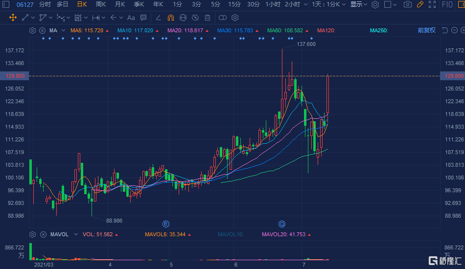 格隆匯7月14日丨昭衍新藥(6127.HK)近期走勢現深V反轉行情,已抹平此前跌幅。報129.8港元有望再度挑戰新高價,漲12.48%,總市值375億港元。昭衍新藥獲摩根大通於07月06日在場內以每股平均價106.7081港元增持18.13萬股,涉資約1934.62萬港元。今年一季度淨利9335.73萬元,同比增長388.07%。美銀預計2021至2023年銷售額將達到15.63億、22.55億及31.55億元。
