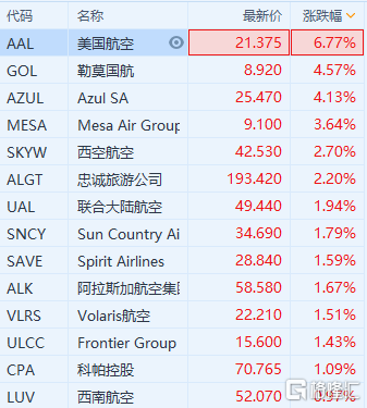 美股航空股走強 美國航空(AAL.US)漲超6%
