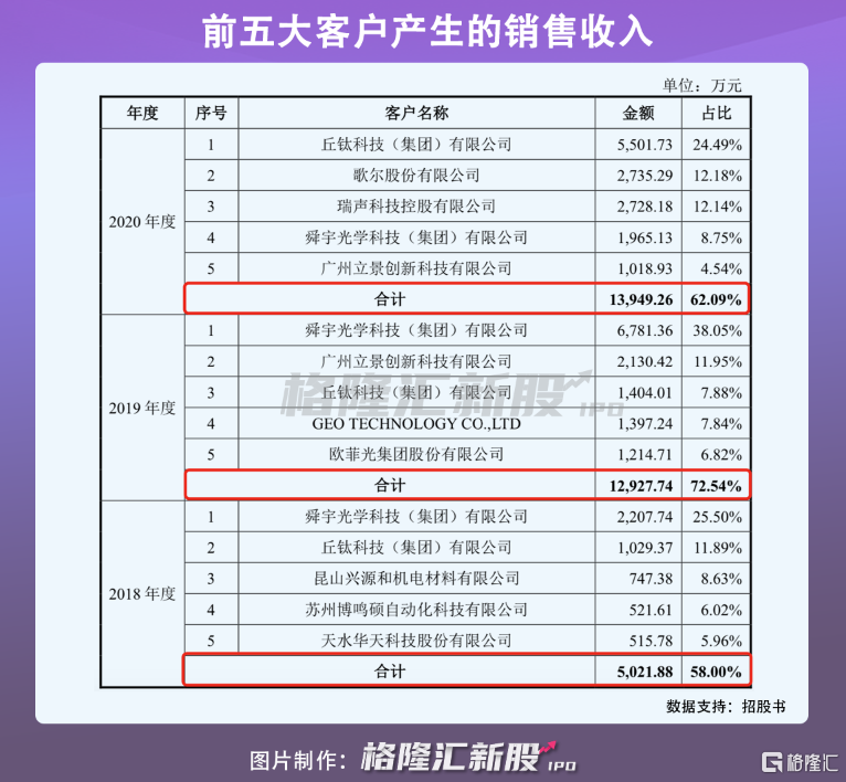 招股說明書顯示,報告期內,銘賽科技向前五大客戶產生的銷售收入分別爲0.5億元、1.29億元、1.39億元,分別佔當期營業收入的58%、72.54%、62.09%。也就是說,銘賽科技每年至少有五成的收入來自前五大客戶。