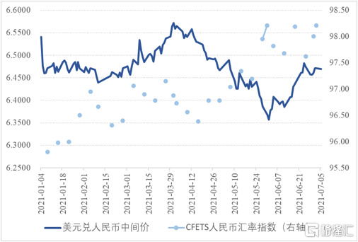2021年第二季度,人民幣兌美元匯率呈現出“V”型走勢。2021年3月31日至6月30日,美元兌人民幣由6.5713上升爲6.4601,升值了1.69%;人民幣兌CFETS籃子指數由96.88上升爲98.00,升值了1.16%。2021年5月28日,美元兌人民幣匯率中間價突破了6.40這一關口,達到6.3858,創下2018年6月以來的新高。