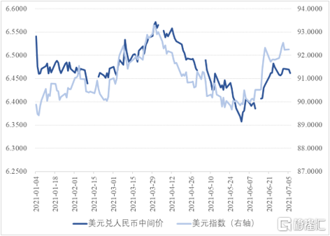 2021年第二季度,美元指數走勢與人民幣兌美元匯率變動呈現出非常強的相關性。美元指數的拐點出現在5月25日,美元指數降至89.6。這與人民幣兌美元匯率變動拐點出現的時間基本一致。這表明,2021年二季度人民幣兌美元匯率變動的主要驅動因素是美元指數的變動。張瑜(2021)認爲儘管人民幣匯率波動貶值的概率更高,但貶值壓力並不大;這一輪人民幣應對美元指數反彈的安全空間很充足,匯率貶值對市場情緒影響會弱於以往。
