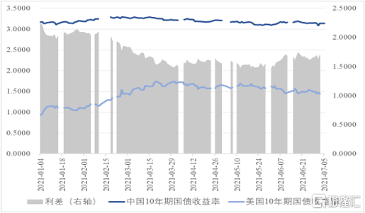 總體來看,中國通貨膨脹仍在可控區間,沒必要因此收緊貨幣政策。這也是爲什麼央行宣佈於2021年7月15日下調金融機構存款準備金率0.5個百分點(不含已執行5%存款準備金率的金融機構)的一個原因。管清友(2021)認爲2021年6月CPI與PPI雙降,表明通脹壓力有所緩解,預留了政策放鬆的空間,進一步加大市場寬鬆的預期,並認爲不太會再現全面寬鬆,國常會也一再重申不搞“大水漫灌”,總體較爲剋制。謝亞軒和高明(2021)提出,社融增速下行趨勢將在下半年趨於平穩;但大宗商品供需缺口仍未根本解決,商品價格和PPI雖然見頂,但三季度仍將保持一定高度;美聯儲退出寬鬆的預期雖然有不確定性,但總體趨向上升。這些因素都指向中、美兩國國債收益率下行空間有限。同時考慮到美國與中國經濟運行差異逐漸縮小,預計中美利差仍將趨於縮小。