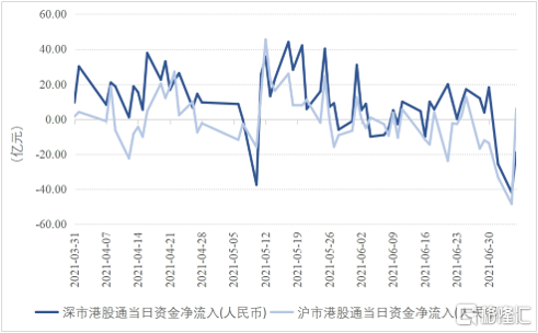 中美利差的擴大會對短期資本流動產生影響。從滬港通、深港通資金淨流入來看,4、5月份,滬港通、深港通資金淨流入規模較大;到了6月份,資金淨流入規模明顯下降。而短期資本流動會影響到人民幣匯率的交易需求,從而影響到人民幣匯率走勢。