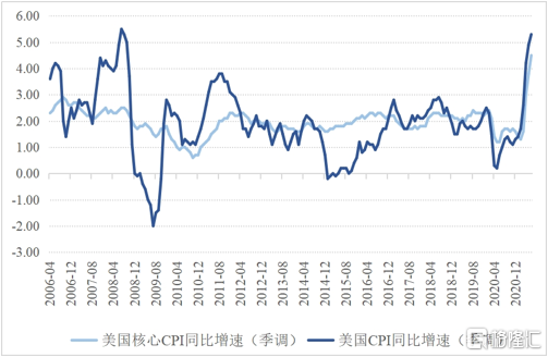 從2021年4月份起,美國通貨膨脹率顯著上升,未來可能繼續上升。2021年4、5、6月,美國季調後的CPI同比增速分別爲4.2%、4.9%、5.3%;季調後的核心CPI同比增速分別爲3.0%、3.8%、4.5%;2021年6月美國季調後的核心CPI同比增速達到2011年9月以來的新高(見圖5)。