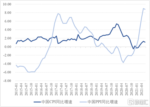 2021年1月至6月,PPI同比增速由0.3%飆升至8.8%。從PPI分項指標來看,生產資料價格上漲是PPI飆升的主要原因。而在生產資料價格中,上漲最快的主要是石油工業、冶金工業、煤炭及煉焦工業與化學工業。這意味着,PPI上升的主要推動力是大宗商品價格上漲。考慮到目前大宗商品價格已經顯著高於疫情前水平,但經濟增長態勢卻顯著弱於疫情前,大宗商品價格走勢將由之前的單邊反彈轉爲寬幅雙向波動。PPI同比增速有望在未來3個月見頂,隨後顯著回落。全年漲幅約在6%上下。