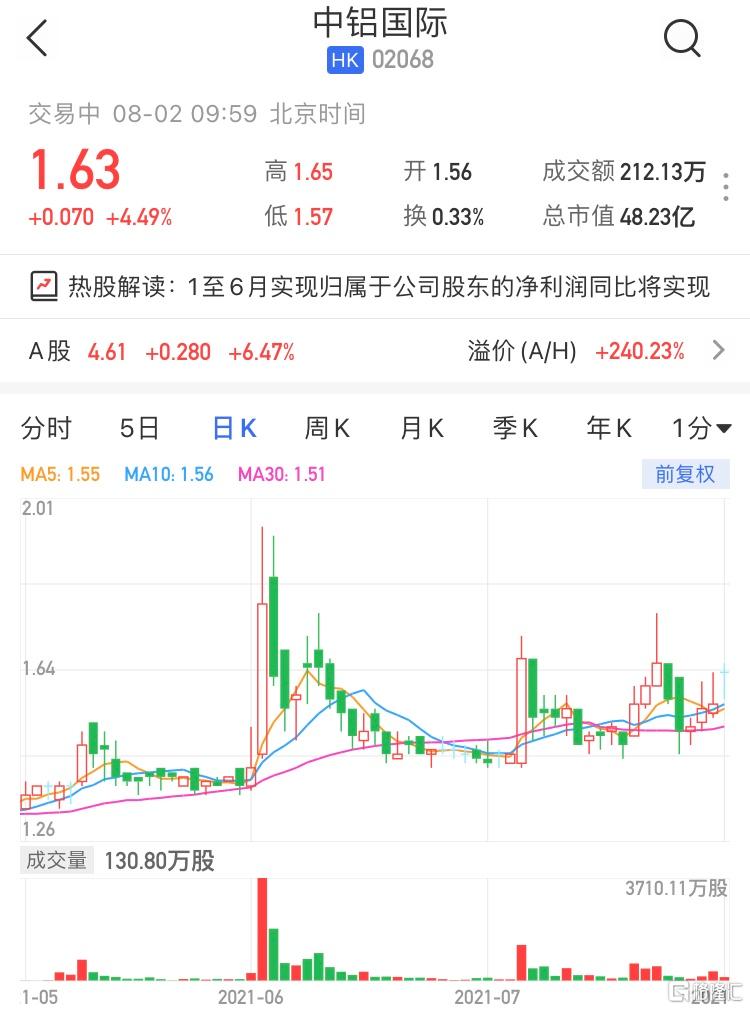 港股異動 | 中鋁國際(2068.HK)漲超4% 預計中期業績扭虧爲盈
