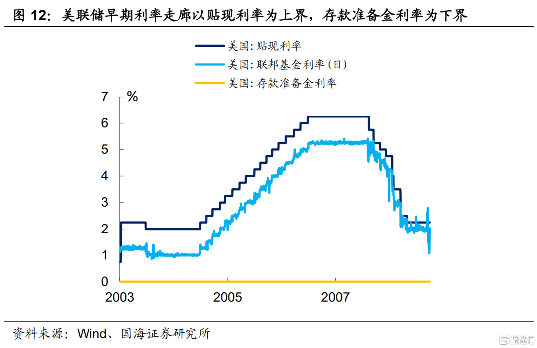 (1)2008年10月以前,利率走廊體系初步確立。與傳統的利率走廊體系類似,美國最早的利率走廊體系以貼現利率爲上界,以存款準備金利率爲下界。由於當時美聯儲尚未創立超額準備金利率,並且在美聯儲的存款準備金並不實際產生利息。因此,下界雖然名義上是存款準備金利率,然而實際上就是0%。