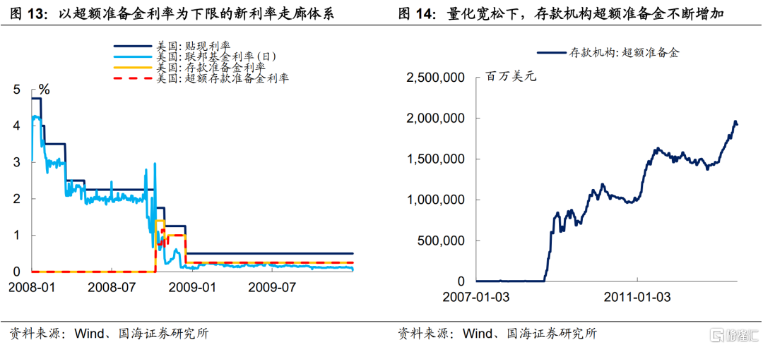 (2)2008年10月至2013年9月,3輪量化寬鬆下的過渡時期。次貸危機爆發後,美聯儲通過量化寬鬆來向實體經濟提供流動性。正如前文提到的,美聯儲量化寬鬆將造成商業銀行超額準備金增加,針對這一情況,美聯儲創立了超額準備金利率(IOER)來接替原先的存款準備金利率作爲利率走廊的下限。