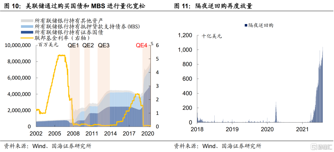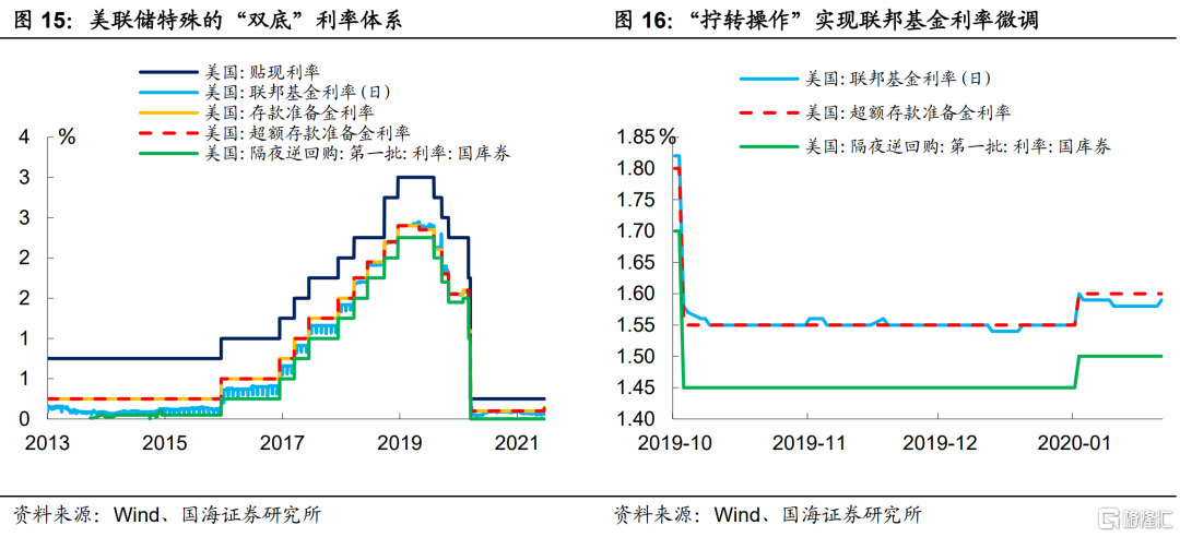 爲此,2013年美聯儲推出了隔夜逆回購(O/N RRP)作爲利率體系中的“次底”,對聯邦基金利率進行託底。其原理是,在超額準備金利率下再設置了一項隔夜利率,覆蓋衆多大型銀行和貨幣基金。隔夜逆回購由美聯儲的對手方發起,美聯儲通過向對手方出售國債及MBS,到期再購回,以此來達到讓過剩的流動性回到美聯儲手上的目的。