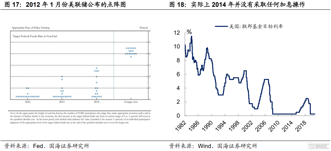 6月份的議息會議結束後,2022年美聯儲將進行兩次加息操作的“論調”不絕於耳。然而歷史上來看,點陣圖對實際加息情況的預測作用較差。2012年1月份也出現過類似情形,當時點陣圖顯示,預計2014年將出現兩次加息操作,事實上,美聯儲上一輪加息在2015年底纔開啓。因此,點陣圖實際上並非是預測聯邦基金利率變動的有效指標,更適合作爲一個用來觀測聯儲官員對當前貨幣政策態度的工具。