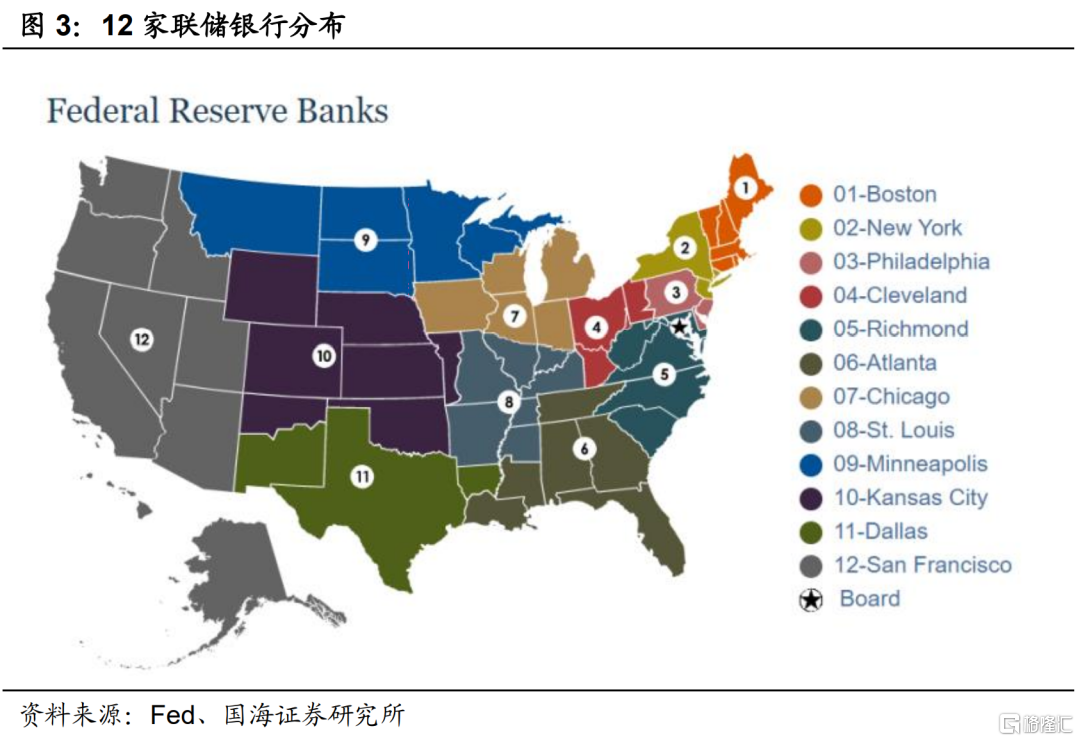 (2)“兩翼”之一:12家聯儲銀行(Federal Reserve Bank)。主要負責美聯儲與各地商業銀行的溝通交流和業務往來,其職能包括貼現、監管、清算、以及擔當國庫。聯儲銀行的股東或出資人是當地商業銀行。
