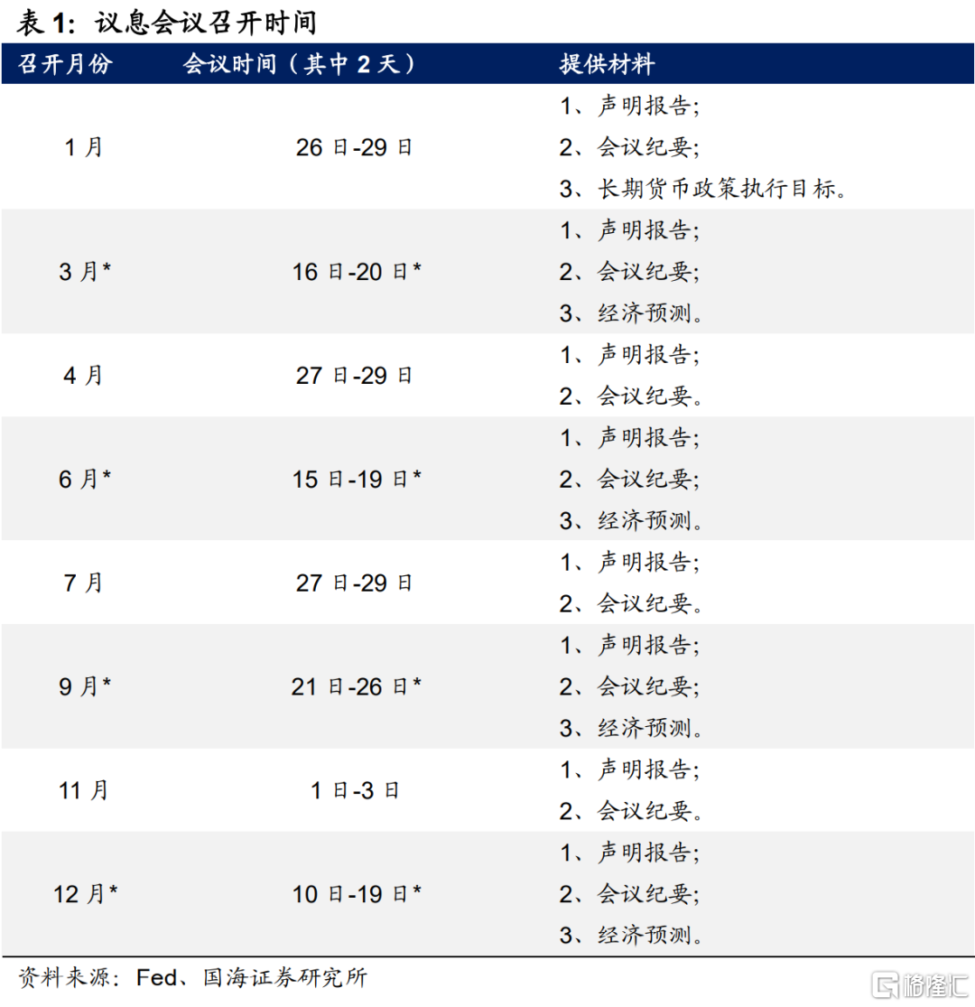 公開市場委員會(Federal Open Market Committee,下稱FOMC)已經成爲美聯儲貨幣政策的執行主體。一般而言,議息會議爲期兩天,在議息會議結束後,美聯儲還將舉行媒體招待會。與會期間FOMC成員將根據美國當下經濟、金融形勢及未來展望,制定下一步貨幣政策執行計劃。FOMC每隔1個半月召開1次議息會議,每年共舉行8次,分別爲每年1月、3月、4月、6月、7月、9月、11月以及12月。值得一提的是,2020年由於疫情原因,僅3月份1個月就召開了5次議息會議。
