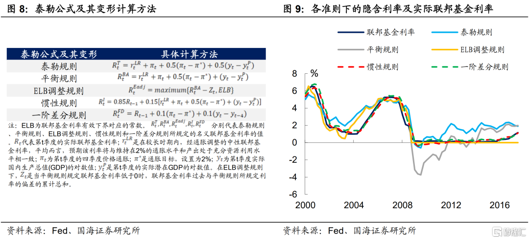 歷史上來看,次貸危機以前,“泰勒公式”及其變形公式的隱含利率對目標聯邦基金利率均有較好的擬合作用。次貸危機後,由於聯邦基金利率已經降至“零區間”,處於降無可降局面,聯邦基金利率和“泰勒公式”隱含利率出現了較大幅度背離。雖然美聯儲在實際制定貨幣政策時需要考慮的變量不僅僅侷限於就業和通脹,但是“泰勒公式”收到了歷屆美聯儲主席的廣泛肯定,爲利率制定提供了一個重要的參考標準。