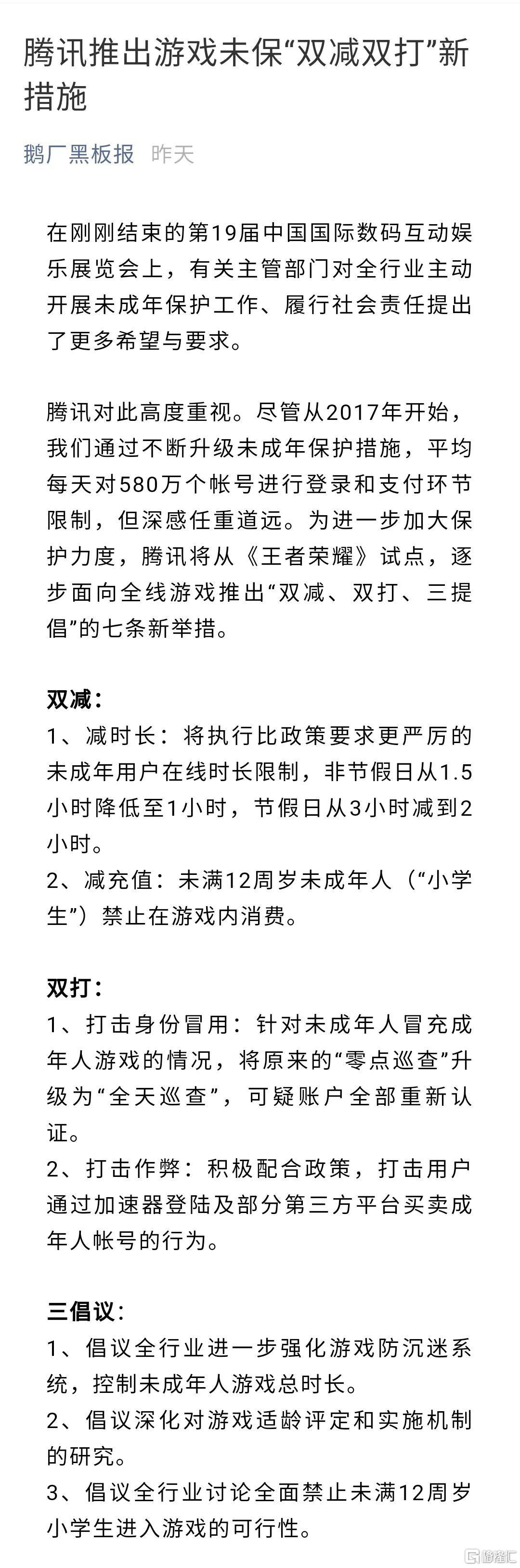 另一邊,被點名的鵝廠眼疾手快,火速宣佈:將從《王者榮耀》試點,逐步面向全線遊戲推出“雙減、雙打、三提倡”的七條新舉措。