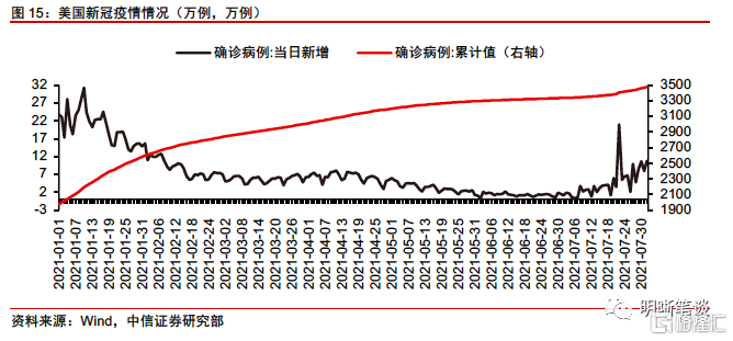 但是也需警惕Delta毒株引發新一輪疫情反彈可能帶來的停工停產風險。近期,在Delta毒株擴散下,美國疫情有所反彈。市場對於疫情反彈影響經濟復甦的擔憂導致美債收益率近期不斷下行。美聯儲主席鮑威爾在7月議息會議後的新聞發佈會上表示,Delta毒株將對公共健康產生影響,但最近的波浪對經濟的影響較小。Delta可能會對勞動力市場的迴歸施加壓力,正在仔細監控。我們認爲儘管美國經濟總體向好,但是仍然需要警惕Delta毒株的影響,一旦疫情反彈引發新的社交限制措施帶來停工停產,那麼美國經濟復甦將被蒙上巨大陰影。