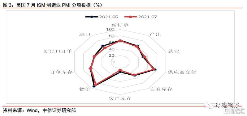 雖然總體PMI有所回落,但分項數據並不悲觀,ISM製造業PMI分項顯示,製造業物價有所回落,就業向好,但供給瓶頸仍是當前影響美國經濟持續復甦的主要原因。從ISM製造業PMI的細分項來看,新訂單、產出、供應商交付、自有庫存、客戶庫存、物價、訂單庫存、新出口訂單和進口項均較上月有所下降,其中物價項和進口項下降最爲明顯,物價項由6月的92.1下降爲7月的85.7,而進口項則從6月的61下降到53.7。就業和訂單庫存則較上月有所增加,其中就業項從6月的49.9上升至7月的52.9,重返榮枯線以上。從分項數據來看,物價水平下降較爲明顯、同時就業復甦進程加快,這對於美國經濟或許是更偏樂觀的現象。與此同時,自有庫存和客戶庫存仍處低位,而訂單庫存擠壓顯示供給瓶頸仍然制約美國經濟復甦。