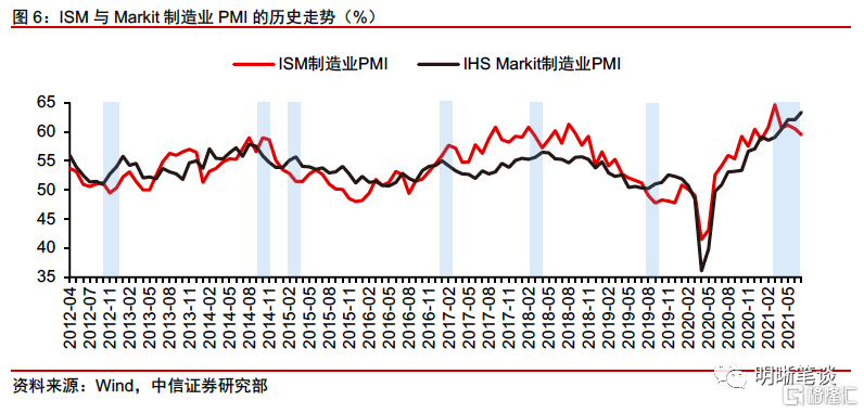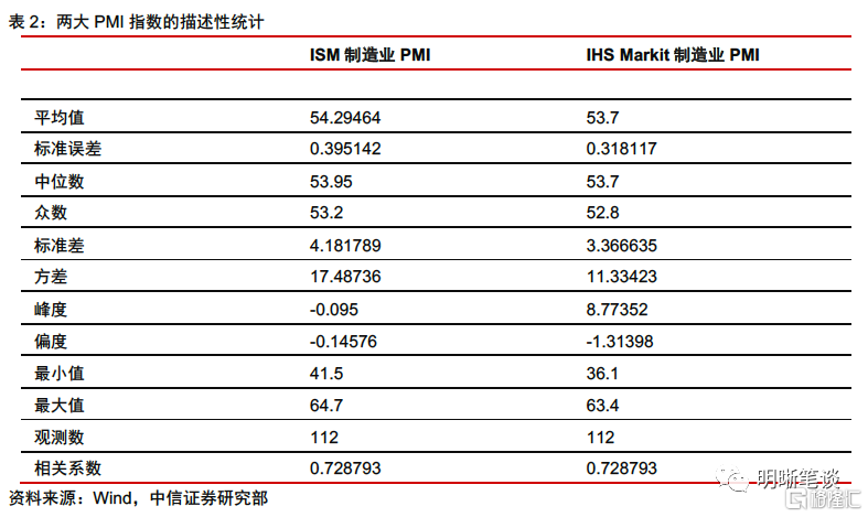 從歷史來看,IHS Markit製造業PMI和ISM製造業PMI總體走勢吻合,但也存在部分時期的分化和背離。從二者的歷史走勢來看,在大多數時期二者趨勢相同,其相關係數爲0.73,但在部分時期也存在分化和背離的現象,例如2012年10月前後、2015年2月前後、2018年3月前後以及最近3個月等。