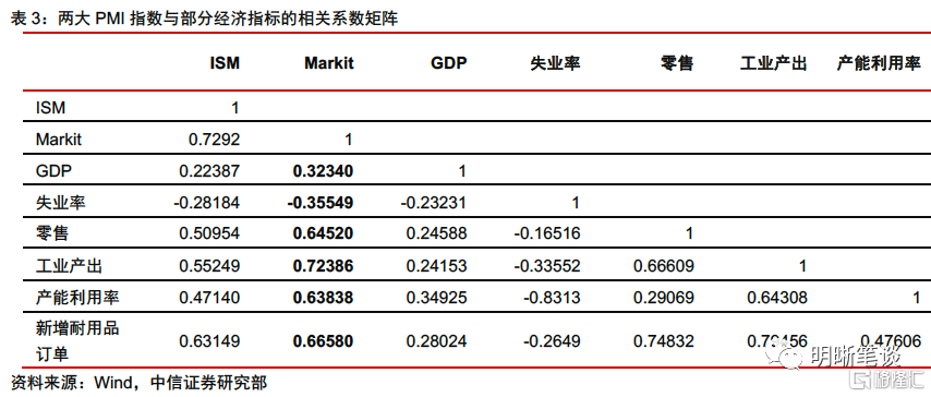 IHS Markit製造業PMI與實際經濟數據的相關性比ISM製造業PMI更強。爲進一步觀察兩大PMI指數對經濟的反映情況,我們選取GDP、失業率、零售、工業產出、產能利用率、新增耐用品訂單等指標與兩大PMI指數進行簡單的相關係數比較。從相關係數矩陣來看,Markit製造業PMI與實際經濟數據的相關性更強,更能反映經濟變動的趨勢。
