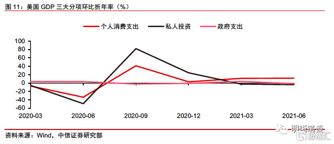 其次,從最新公佈的二季度GDP數據來看,儘管二季度GDP環比折年率爲6.5%,低於市場預期,但其結構並不令人過分擔憂。美國二季度GDP環比折年率初值錄得6.5%,低於預期的增長8%,但是增速仍然高於疫情前水平。從分項來看,作爲美國經濟最主要拉動力的消費持續發力,環比折年率爲11.8%,出口也環比轉正,環比折年率爲6%,私人投資(-3.5%)和政府支出(-1.5%)成爲拖累項。由於疫情後刺激經濟的財政力度正逐漸退坡,因此政府支出下降情有可原。後續來看,預計個人消費支出延續走強將繼續拉動美國經濟增長,同時也在一定程度上帶動私人投資向好,而實施“大財政”的拜登政府也將在政府支出方面持續拉動美國經濟,因此從結構來看,並不必對美國經濟過分擔憂。