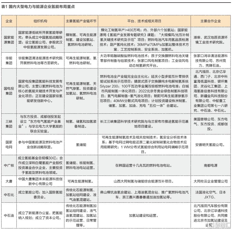 當前我國氫能發展處於初期,各大央企從氫能基礎設施建設、關鍵技術研發、產品推廣應用等場景積極佈局。據香橙會研究院統計,2019年國務院國資委監管的96家央企中,開展氫能相關業務或佈局的中央企業有26家,數量佔比高達27%,涉及的氫能產業鏈側重於制氫、氫燃料電池研發以及加氫站建設。從氫能產業相關佈局來看,各大企業分別從組織機構、核心關鍵零部件技術、示範工程項目等方面開展相關工作,詳情見表1。