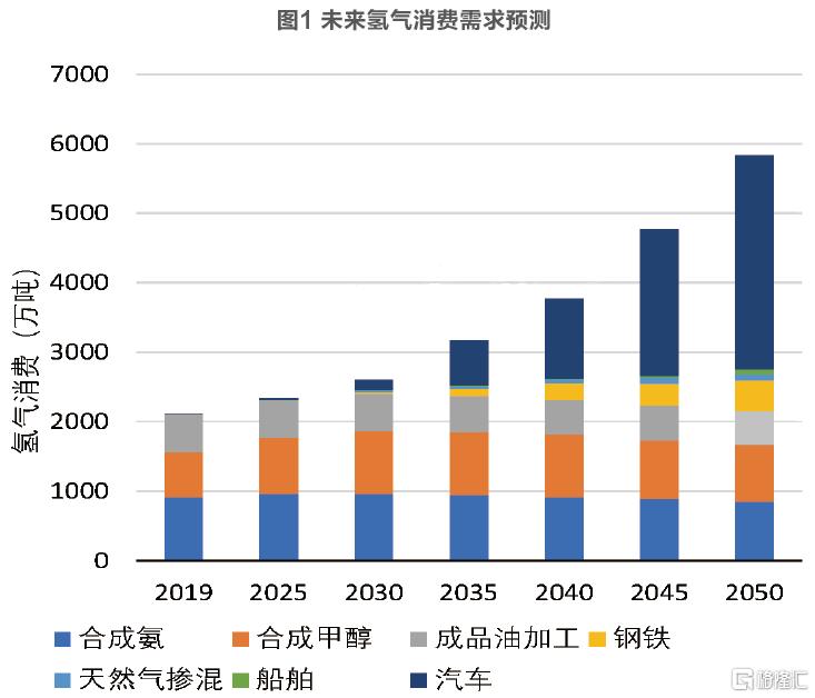 2020年中國氫氣產量約3342萬噸,現有制氫產能約4100萬噸/年,供略過於求,低成本氫氣供給相對充足。據中國氫能聯盟預計,到2030年中國氫氣需求量將達到3500萬噸/年,在終端能源體系中佔比5%,主要增量來自交通運輸的燃料電池車,產能缺口約1000萬噸/年;到2050年氫能將在中國終端能源體系中佔比至少達到10%,氫氣需求量接近6000萬噸/年,其中交通運輸領域用氫2458萬噸,工業領域3370萬噸,其他領域110萬噸,產業鏈年產值約12萬億元,產能缺口約3500萬噸/年。