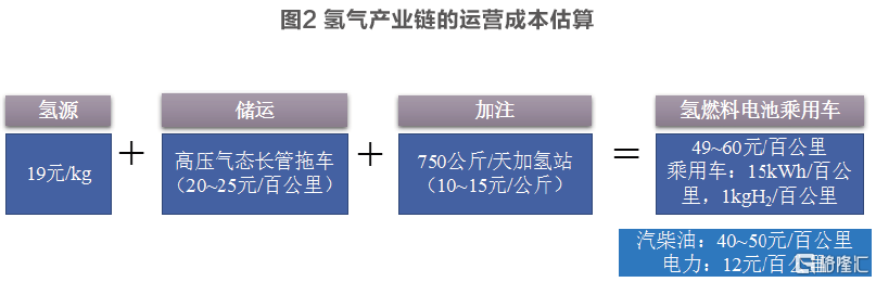 氫能儲運及利用方面,儲運技術尚未實現突破,成本偏高,最終導致氫氣在終端應用上銷售價格偏高,如圖2所示,以0.3元/千瓦時,5.5千瓦時/立方米氫氣條件下,電解水制氫時,不考慮損耗,氫源價格約為19元/kg,到燃料電池終端的運營成高達60元左右,高於汽柴油和電車的運營成本。