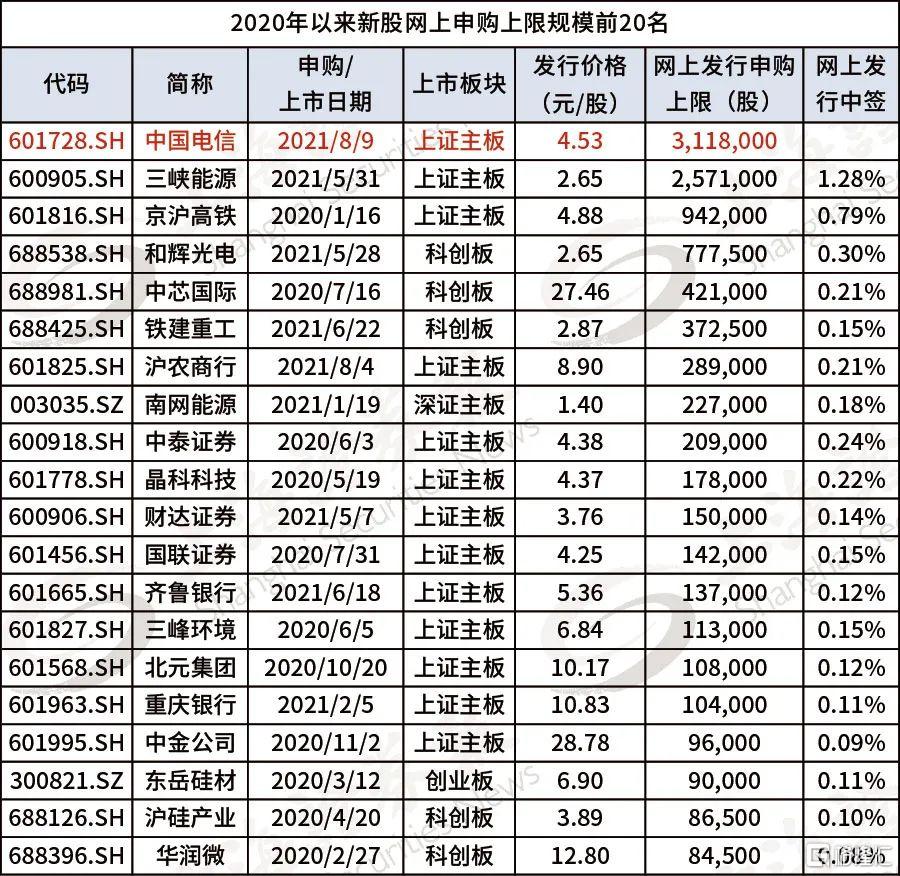 以之前申購上限排名第一的三峽能源為例,它的發行價為2.65元/股,申購上限257.1萬股,中籤率高達1.28%,創新股發行制度改革以來的中籤率新高。此次,中國電信有望再度刷新紀錄。