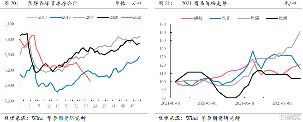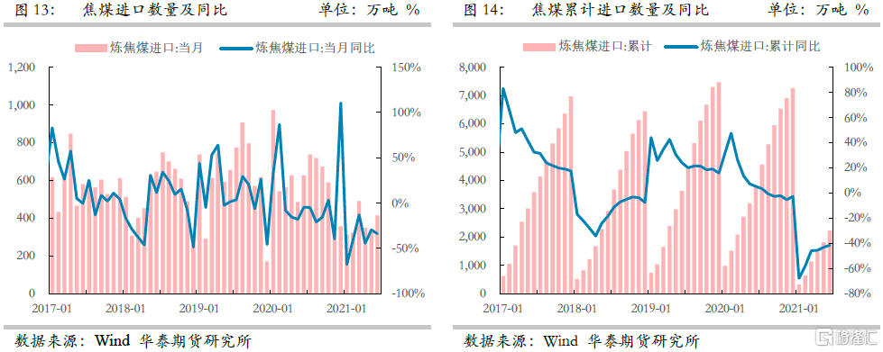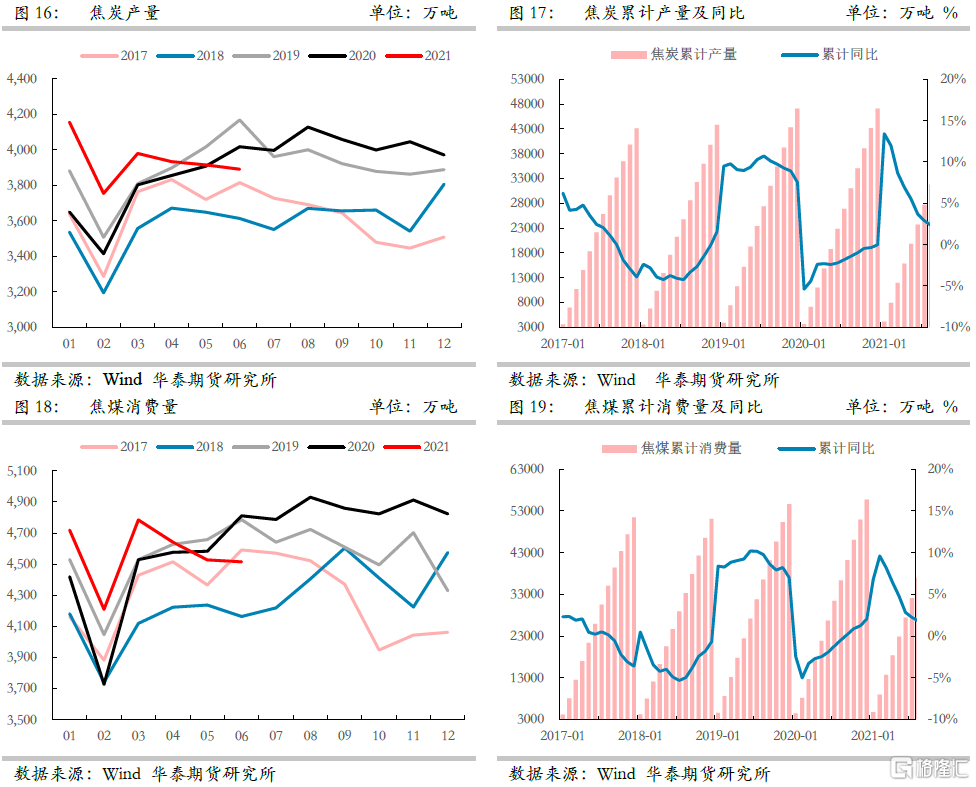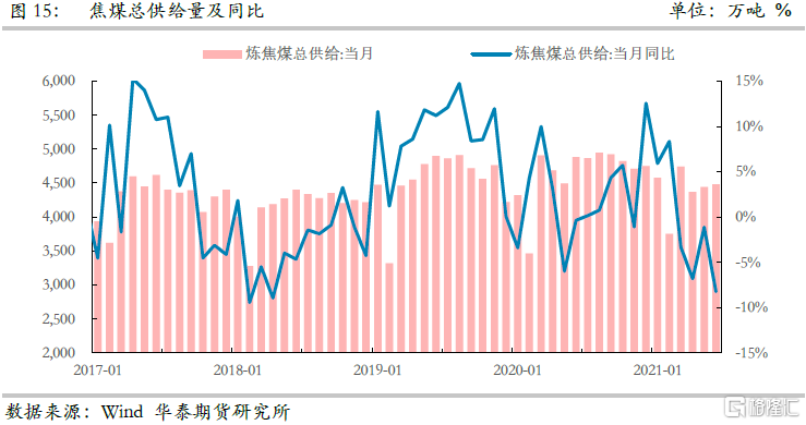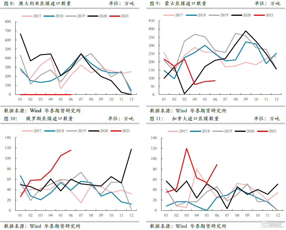 5、縱觀2021年下半年國內焦煤供給形勢依舊難言樂觀,安檢與環保依舊嚴控煤礦難超覈定產能生產,而中澳關係年內難以預見修復,蒙古疫情雖有緩解但依舊存在爆發的可能,因此華泰期貨研究院對下半年焦煤供給量大致研判,認爲下半年焦煤國內實際供給同比減少500萬噸,蒙煤進口量同比減少500萬噸,澳煤進口量同比減少1000萬噸,下半年供給同比減少2000萬噸左右。