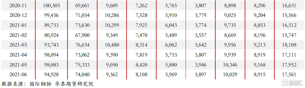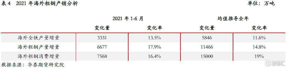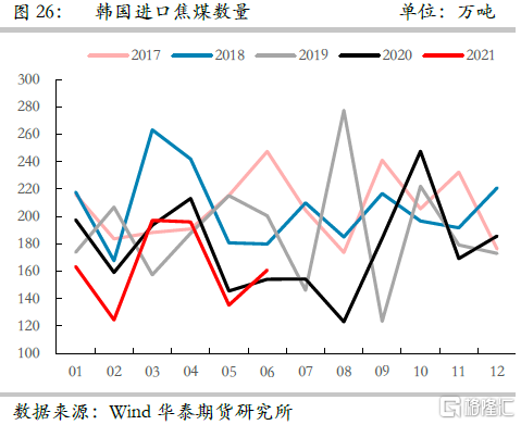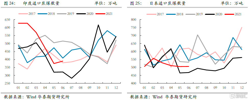 2021年上半年海外經濟復甦,主要經濟體製造業PMI自年初開始均恢復至榮枯線以上,且維持高位或連續增長,貨幣環境相對寬鬆,由此帶來海外鋼鐵製造業的供需兩旺。據華泰期貨研究院統計,1-6月份海外粗鋼產量同比增加6677萬噸,增速達17.9%,海外粗鋼消費同比增加7568萬噸,增速達16.4%,與此同時也帶來海外對於焦煤需求的增加,據煤炭資源網統計1-6月份印度焦煤進口量同比增加538萬噸,隨着供給恢復,6月份日本與韓國焦煤進口量也實現同比正增長。