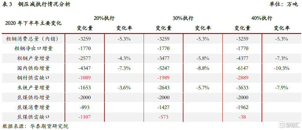 根據中鋼協測算2021年1-6月份國內粗鋼產量累計增加6000萬噸,按照相關部門關於2021年粗鋼壓產目標,下半年國內粗鋼同比壓減不低於9000萬噸,如此巨大的粗鋼減產勢必造成市場上資源極度短缺和恐慌情緒蔓延,因此考慮到國有企業較民營企業執行政策的決心和力度大,下半年粗鋼主要壓減任務實則落在國有企業身上。華泰期貨研究院根據政策執行力度進行分維度研判,按照20%的謹慎預判、30%的中性預判和40%的樂觀預判進行分析,其中按20%執行,粗鋼產量同比壓減2577萬噸,其對應的焦煤消費減量爲893萬噸;按30%執行,粗鋼產量同比減壓3477萬噸,其對應的焦煤消費減量爲1427萬噸;按40%執行,粗鋼產量同比減壓4377萬噸,其對應的焦煤消費減量爲1962萬噸。通過前文對於下半年焦煤供給的分析可以發現,只有達到40%以上的粗鋼壓產執行力度纔有可能使得焦煤形成。